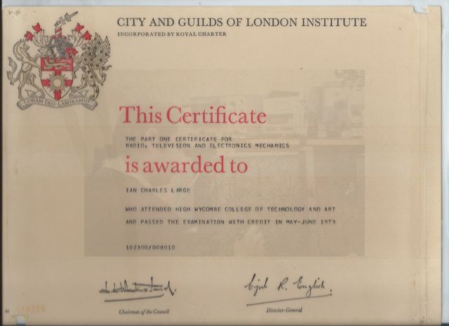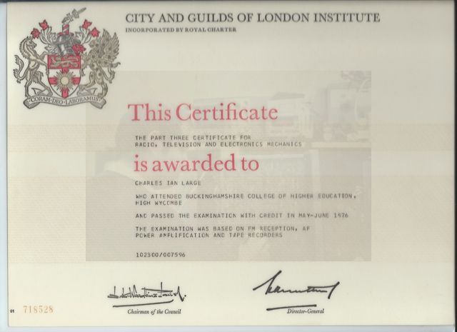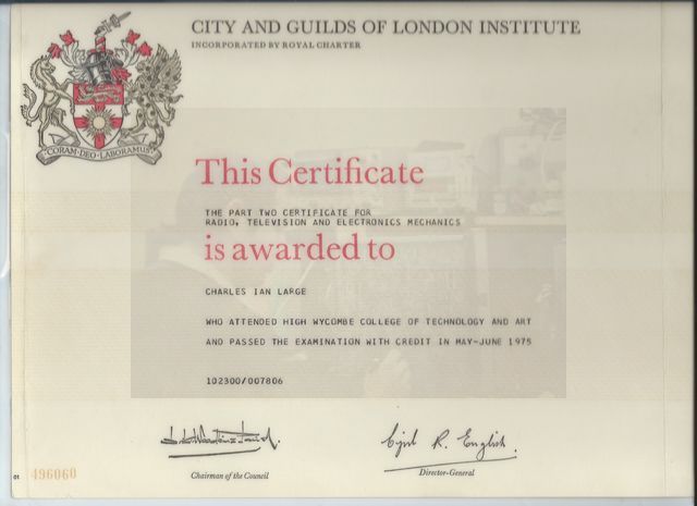 Chas began working in the field of Radio repairs whilst still at school in the 60s and when he left, attended Bucks College of further education - now Bucks University - in High Wycombe, on a Day release, City & Guilds 222 Radio, Television and Electronics Mechanics course, achieving high grades and certification. Further to this he attended Slough College at night classes to achieve the final "Additional Colour Television" qualification. Later, in-house and manufacturers training courses added to his skills and abilities. Here are his main City & Guilds Certificates - reduced and watermarked.