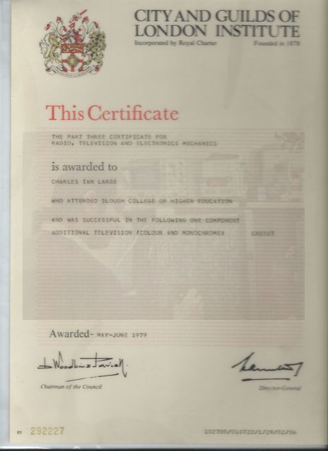 Chas began working in the field of Radio repairs whilst still at school in the 60s and when he left, attended Bucks College of further education - now Bucks University - in High Wycombe, on a Day release, City & Guilds 222 Radio, Television and Electronics Mechanics course, achieving high grades and certification. Further to this he attended Slough College at night classes to achieve the final "Additional Colour Television" qualification. Later, in-house and manufacturers training courses added to his skills and abilities. Here are his main City & Guilds Certificates - reduced and watermarked.